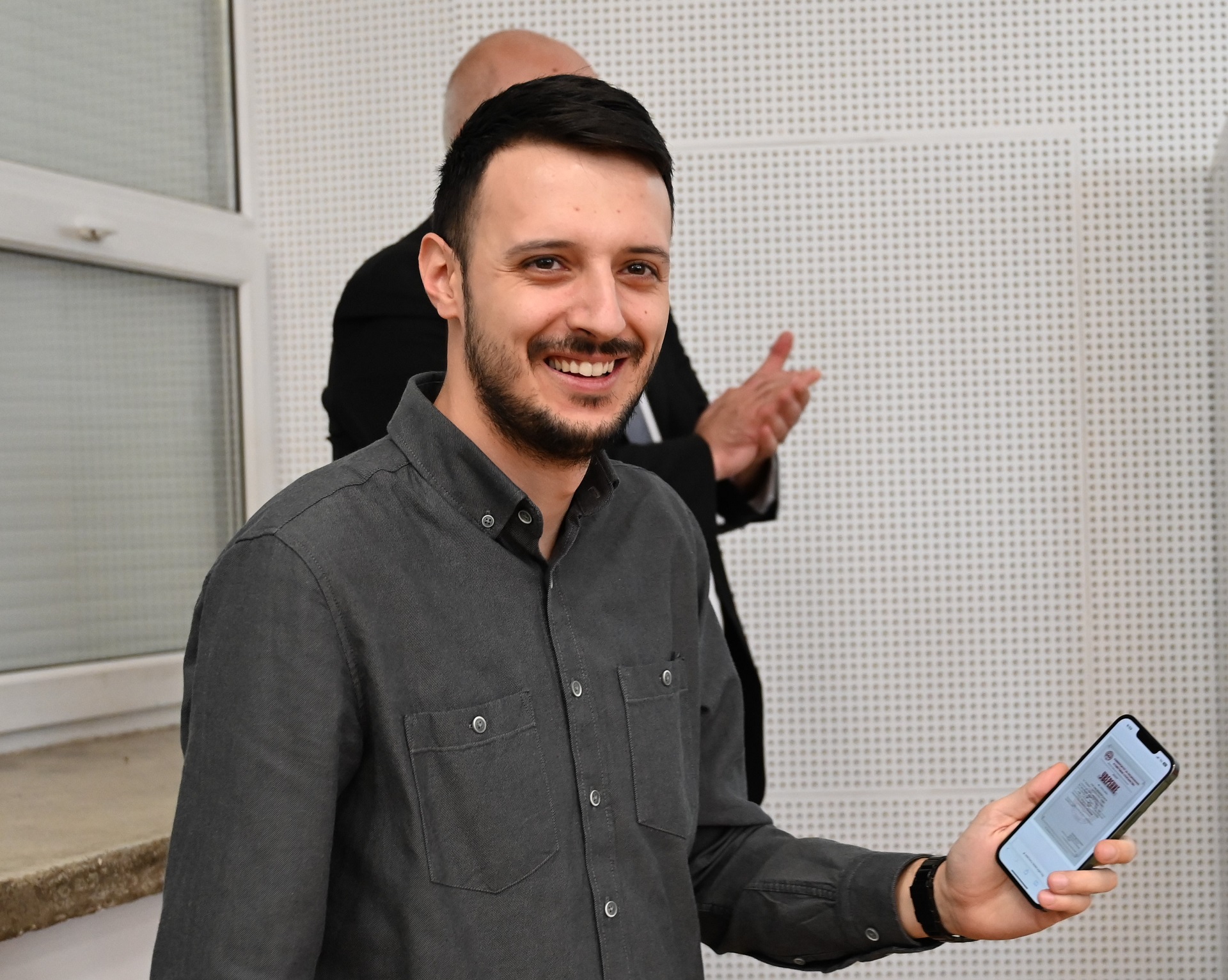 Честта да получи е-уверение № 1, е на студента от втори курс, специалност „Бизнес информатика и комуникации“ Кристиян Тодоров. Младежът демонстрира нагледно пред колегите си стъпките от подаването на заявлението на интернет страницата на Министерството на електронното управление до получаването на документа, подписан с електронен подпис. Електронното уверение е подписано с електронен подпис от администрацията на УНСС и е валиден електронен документ, който ще послужи на студента пред съответната институция, за която е необходимо.