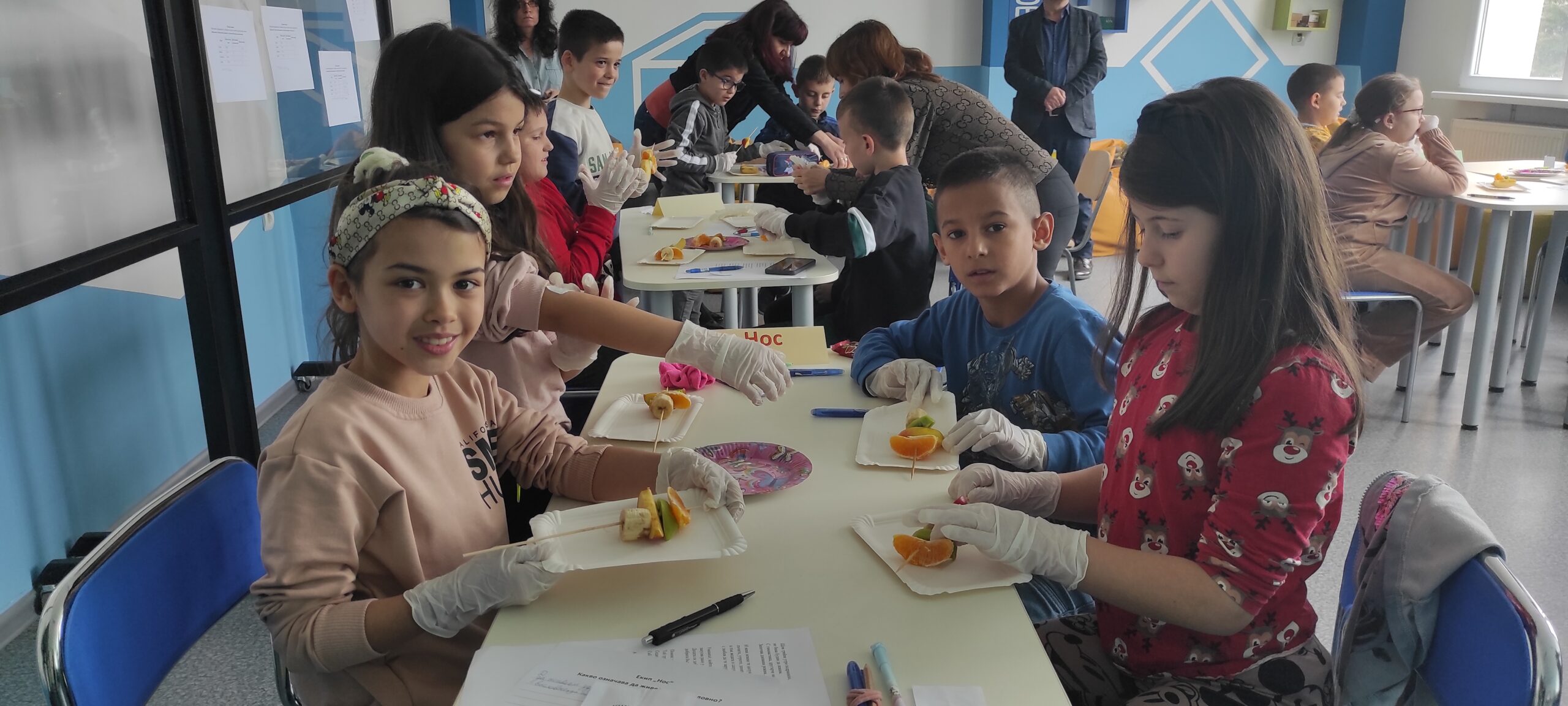 Малчуганите си правят и плодово шишче с ябълка, банан, портокал и киви, без да забравят да си сложат ръкавици, за да спазват хигиенните норми. Преди това обаче всяка група, използвайки знанията си за таблицата за умножение, изчислява колко ще им струва.
