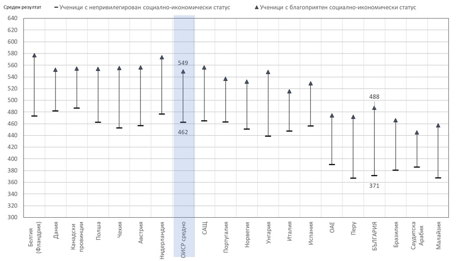 Социално-икономическият статус на учениците също оказва влияние. У нас 15-годишните с по-благоприятен социално-икономически статус постигат средно 488 точки, докато младежите с непривилегирован – 371 точки. Така разликата между едните и другите е 117 точки.