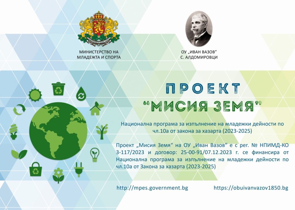 Проект „Мисия Земя“ в ОБУ „Иван Вазов“ в с. Алдомировци с рег. № НПИМД-КО3-117/2023 и договор: 25-00-91/07.12.2023 г., финансиран от Националната програма за изпълнение на младежки дейности по чл.10а от Закона за хазарта (2023 – 2025) към Министерството на младежта и спорта, завърши успешно, отчитат със задоволство от Обединеното училище.