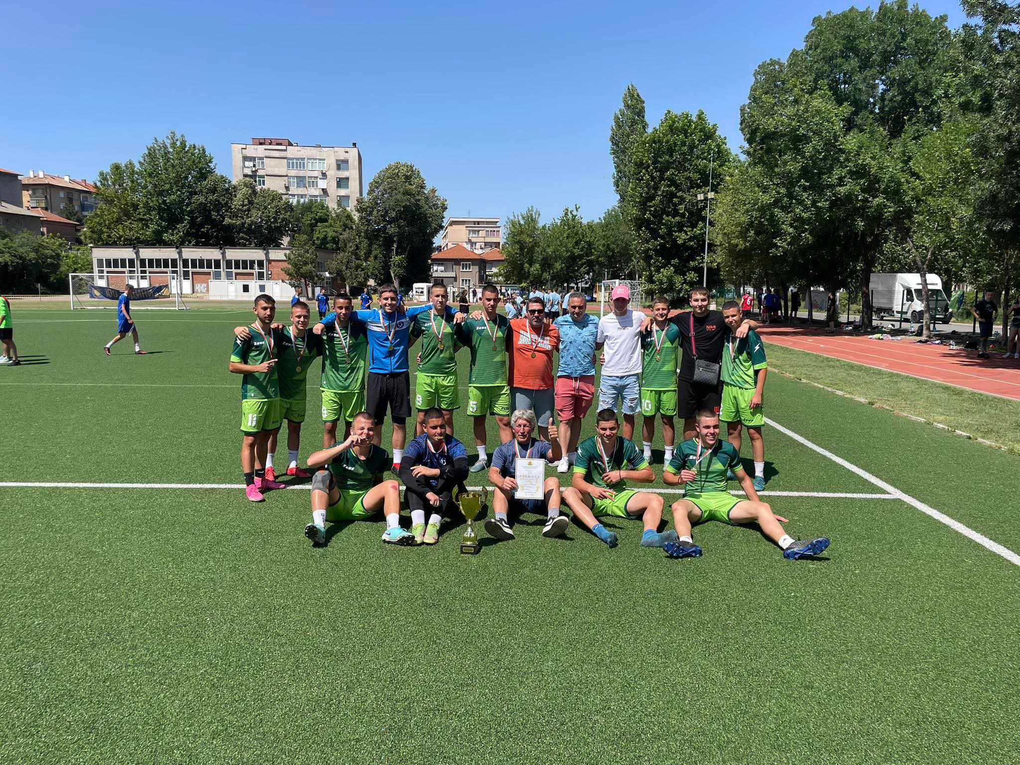 Отборът на ГСАГД „Кольо Фичето“ – Ямбол, си осигури място на Световното ученическо първенство по футбол догодина в Тайланд, след като спечели тази година титлата в Ученическите игри за юноши в групата VIII – X клас. Снимка – ГСАГД „Кольо Фичето“ – Ямбол