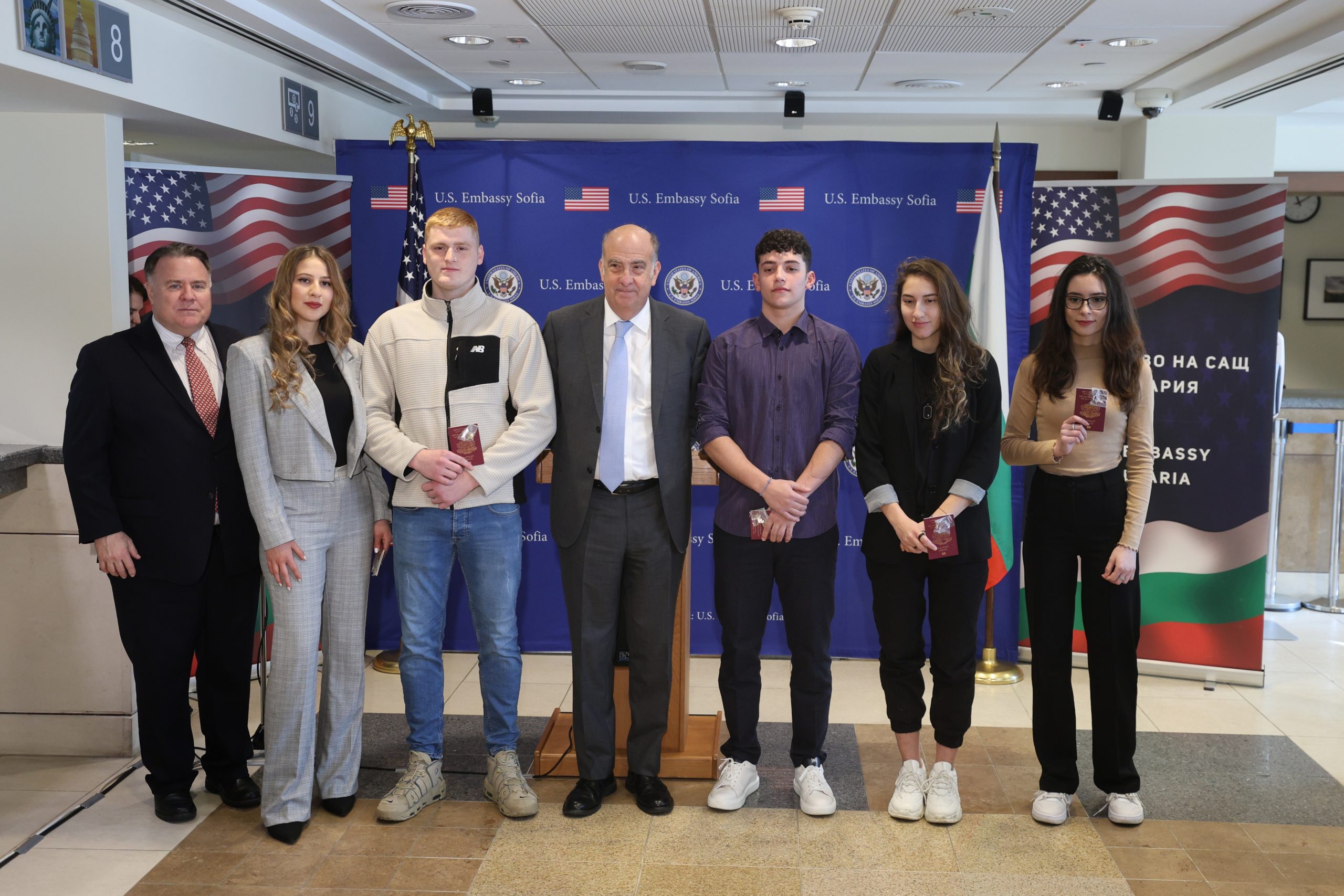 Дипломатът връчи паспортите с първите издадени визи на петима български студенти, които ще участват в летните студентски бригади в САЩ тази година.