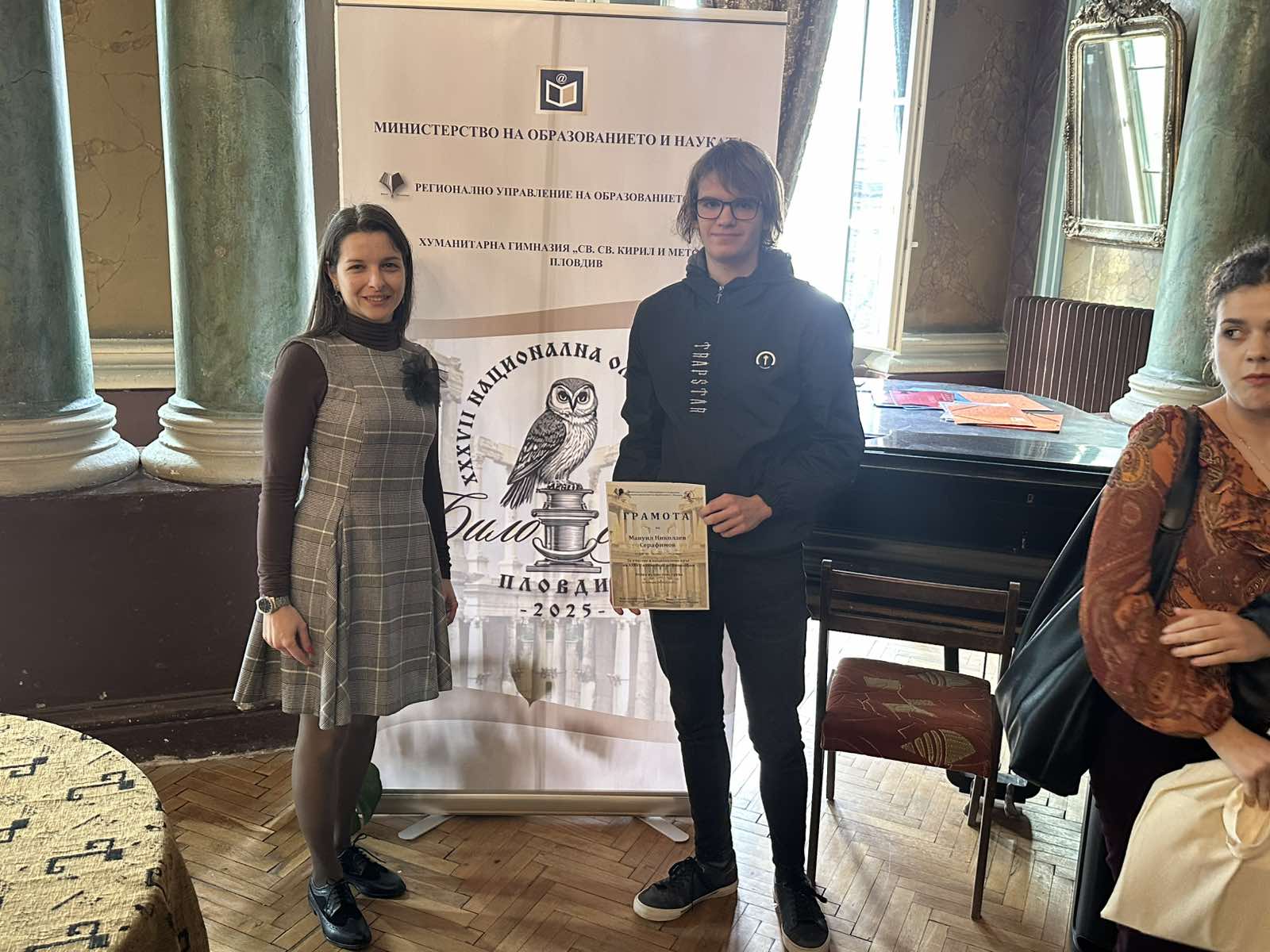 Той е ученикът, който постигна изключително високи резултати на областния кръг на Националната олимпиада по философия (осмо място в общото класиране), лауреат е на Националната олимпиада (четвърто място) и е част от националния отбор за Международната олимпиада по философия.