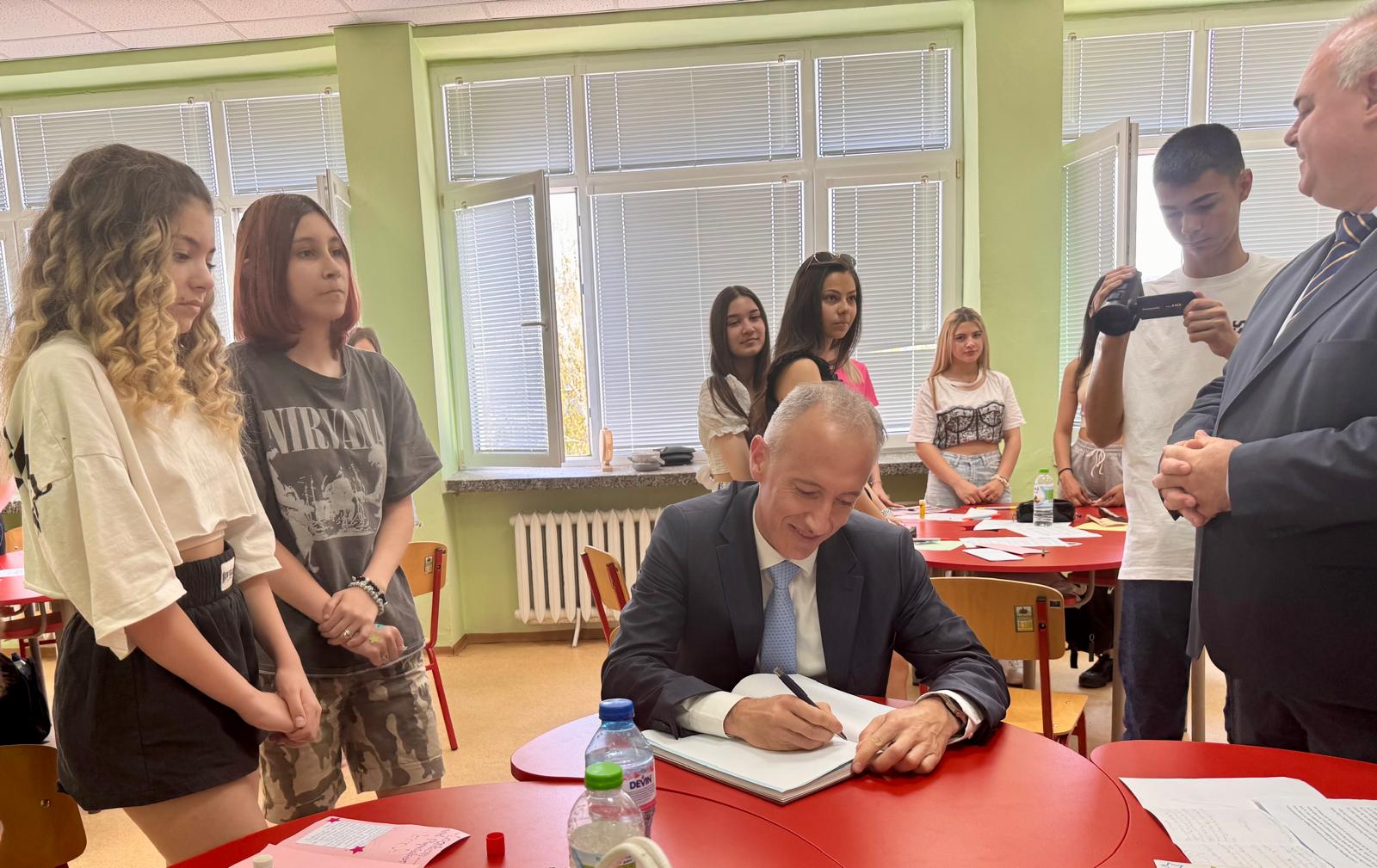 „Учителите и учениците са същината на едно училище и на вас се дължат успехите, които гимназията постига“, обърна се министърът към директора Иво Райнов и колектива.