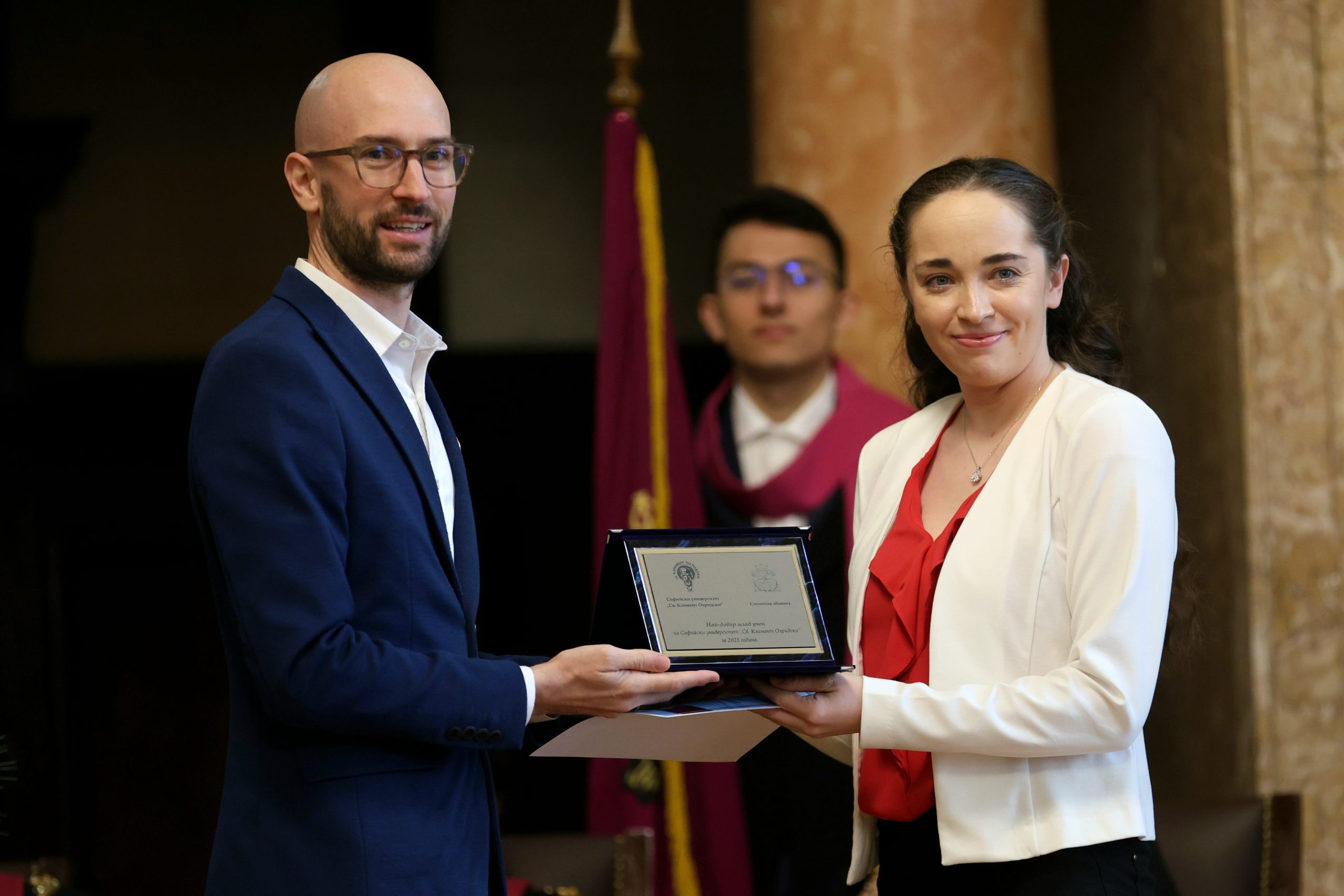 За първа година кметът на Столичната община отличава млад учен от Софийския университет с почетен знак, а носител на наградата за принос в хуманитарната наука е главен асистент д-р Екатерина Томова от катедрата „Теория на възпитанието“ на Факултета по педагогика на Софийския университет.