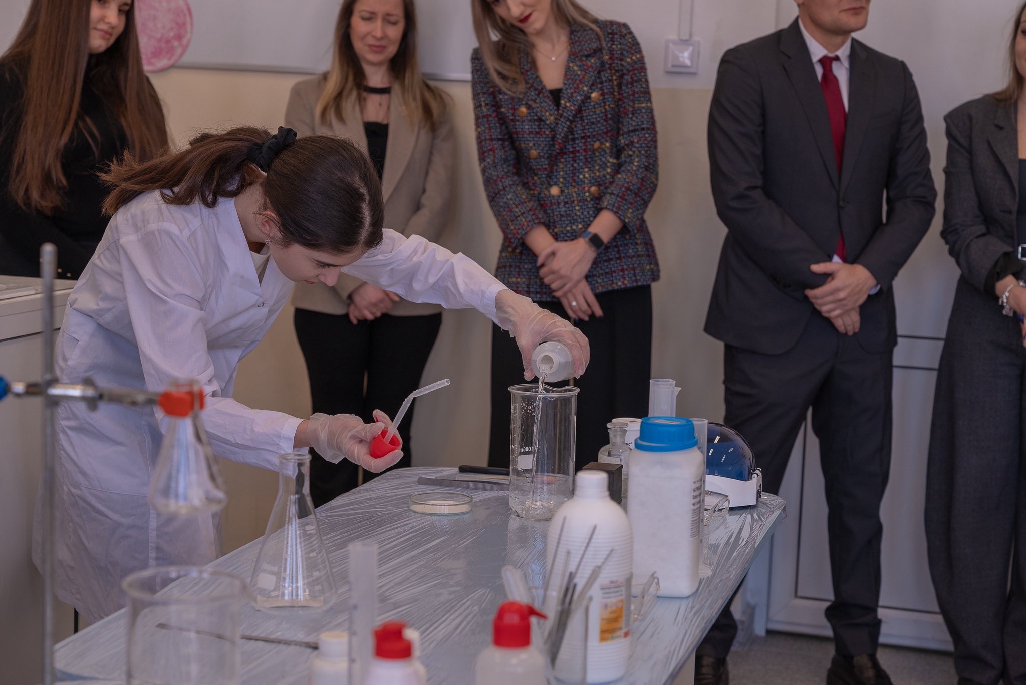 Още в първия ден от отварянето на STEM центъра учениците от прогимназиален и гимназиален етап влизат в ролята на изследователи – в открит урок в новите свързани кабинети те провеждат опити по химия, демонстрирайки дигитални умения и критично мислене.