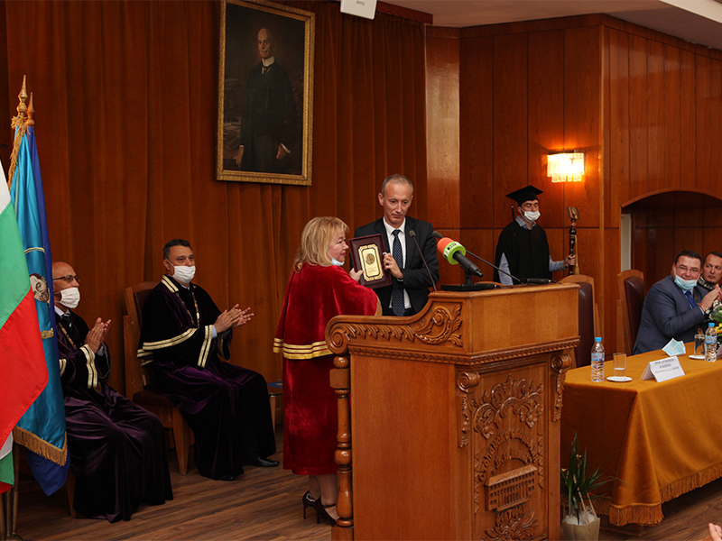 По традиция градоначалникът награждава и отличника на завършилия випуск бакалаври – тази година това е Фелия Попова от специалност „Икономика на туризма“. Академични призове получават и отличниците на всички факултети на висшето училище. Гостите посетиха и обособения фронт офис за обслужване на студенти, създаден чрез дарение от възпитаник на Стопанската академия.