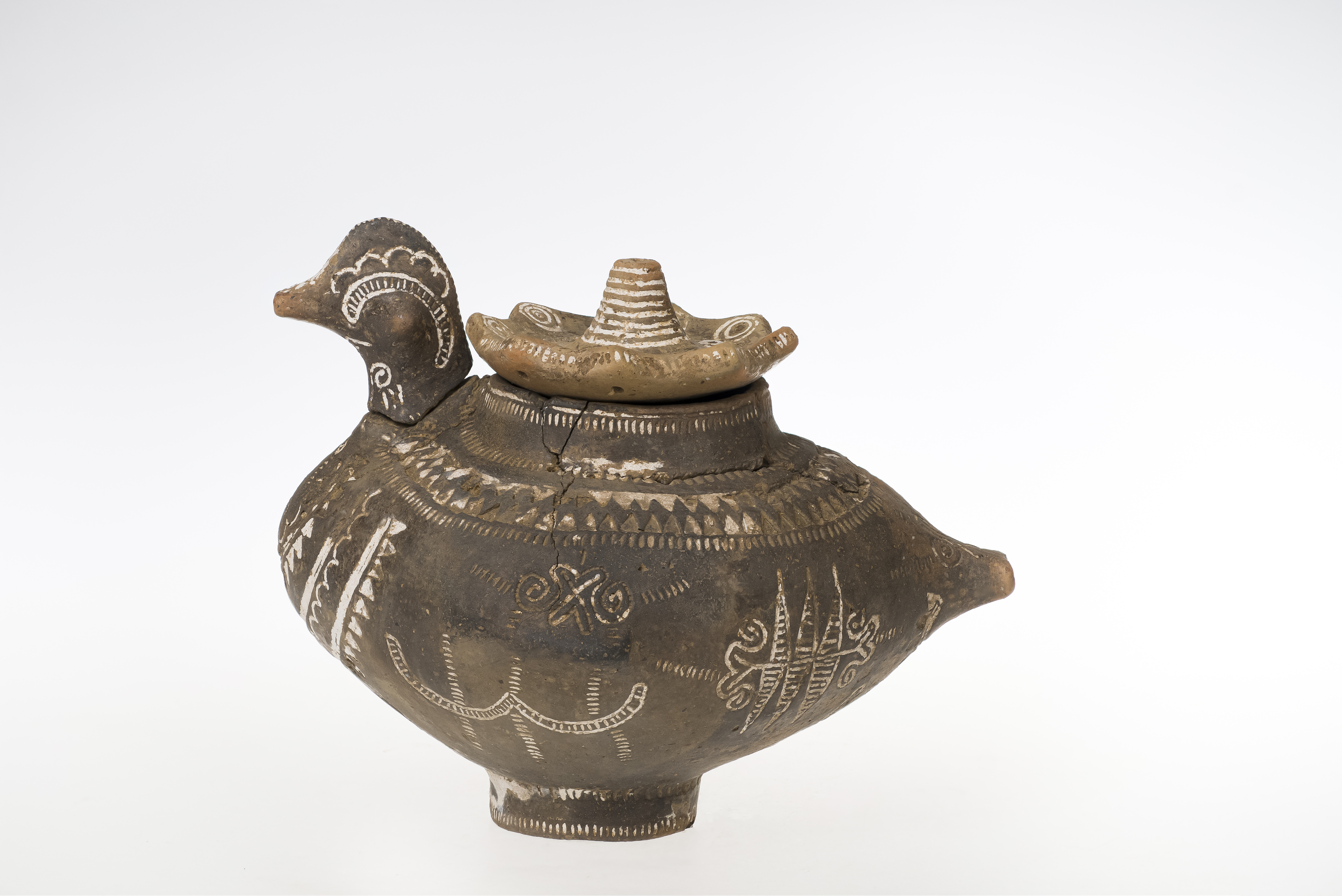 На снимката – изящно изработен съд във форма на птица, с богата инкрустирана украса от некропола до с. Балей, Видинско.