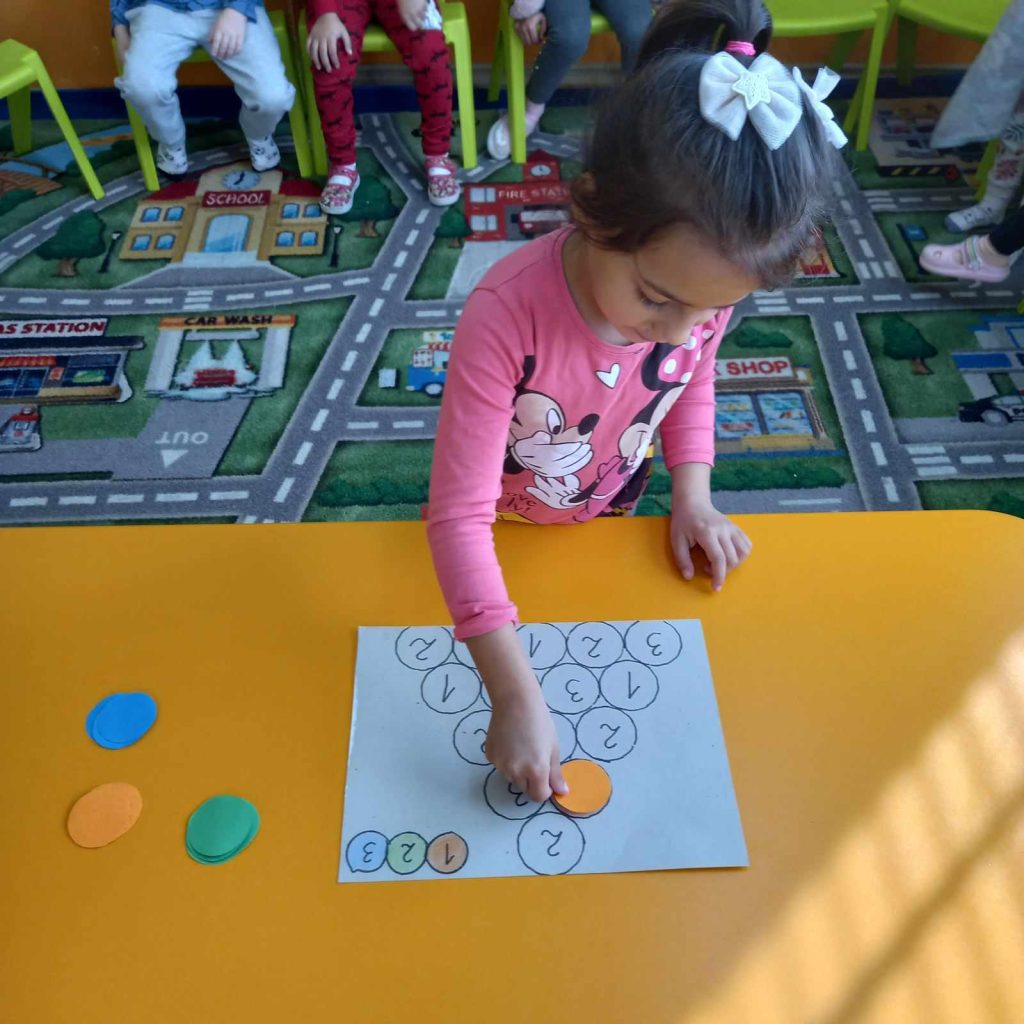 „В работата си използваме много природни материали“, разказва директорката. Често творят с листа, камъни, шишарки, кестени или пръчки. Освен това с достъпни материали от бита – сламки, пластмасови капачки и клечки се учат да пишат и броят. Наскоро правят знаме от капачки, които старателно оцветяват в цветовете на националния трибагреник. От картон пък решават да конструират робот, който досущ прилича на истински. С цифрите се запознават също благодарение на картон, от който правят кубчета.