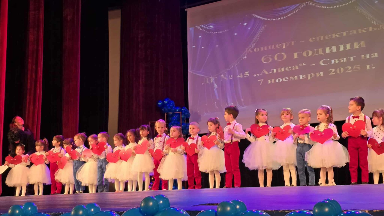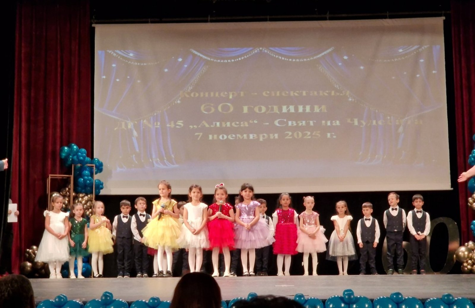 Столичната 45. ДГ „Алиса“ отбеляза своята 60-годишнина с голям концерт на 7 ноември в кино-театър „Освобождение“. На сцената излязоха всички възпитаници на градината. С много артистичност, вълнение, трепети и с красиви сценични костюми малчуганите представиха пред публиката невероятни песни и танцови хореографии, създадени от техните учители.