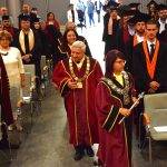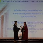 От името на първенците приветствено слово към абсолвентите произнесе магистър инженер по компютърни системи и технологии Цветелина Стефанова – дипломирана с пълно отличие и първенец на випуска сред абсолвентите от техническите специалности. Тя благодари на преподавателите от Русенския университет от името на отличниците и пожела на всички здраве, творчески ентусиазъм и сили.